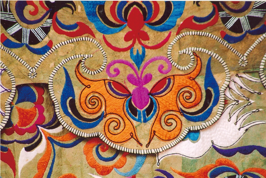 在苗族各種工藝的服飾圖案中,蝴蝶是俯拾皆是的,而丹寨縣雅灰鄉(xiāng)和榕江縣高排鄉(xiāng)等地的苗族百鳥衣上,大面積地使用絲帛和絲線刺繡,常在中心位置繡著一種奇特造型的動物圖案,頭是變形的鳥頭,身是蟲身,有節(jié),周圍是飛舞的蝴蝶。不少人解釋它為龍。其實那是蠶蟲、鳥、蝴蝶的結合:蝴蝶——鳥——蠶蟲——一幅圖本身就包含了蝴蝶圖騰的全部寓意。