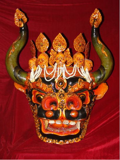 據(jù)普布次仁介紹,早在吐蕃王朝時期,西藏就有宗教舞蹈羌姆和名為“吉達吉姆”的歌舞劇。“吉達吉姆”在演出時演員要戴上白色面具,其表演的內(nèi)容是請求天神降雨或不要讓本地出現(xiàn)冰雹、刮大風(fēng)等自然災(zāi)害。這種歌舞劇在今天的日喀則地區(qū)仍然存在,人們常將之稱為“抗災(zāi)歌舞”。而在宗教舞蹈羌姆中,面具多數(shù)是根據(jù)佛經(jīng)及寺院殿堂中的塑像制作的,制作手法要求較高,以立體造型為主。