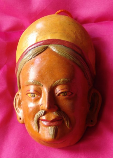 泥塑面具的制作也很有講究:“首先要將面具模型徹底風(fēng)干,然后在表面敷上摻有液體樹膠和面粉熬制而成的糨糊,再用一小塊布將風(fēng)干好的模子包好裹嚴,接著要敷一層柴薪混合物,同樣用另一塊布把泥模包實,反復(fù)四五次后,將模子放好讓它自然干透。這些步驟做完后,要用一根棍子敲打出包在里面的泥模,這樣就形成了布、樹、膠和面粉做成的一種面具。當(dāng)然,做好后還要進行彩繪、涂清漆,這樣才能讓一個面具光彩奪目。”邊巴說道。