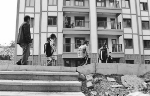 教師楊紹書和學生從新居前走過。歐東衢攝