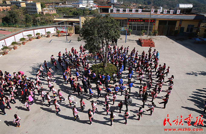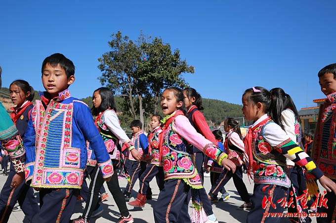 伴隨著三弦琴悠揚的旋律和整齊的舞步聲,我們走進云南省楚雄市大過口鄉(xiāng)中心民族小學校園,映入眼簾的便是身著彝族服裝的老師和學生們,他們在操場上圍成了三個大圓圈,用彝語和漢語歡快地唱著跳著。進入大圈里,近距離看著手捧三弦琴的高年級同學,還有那些奮力吹著葫蘆笙的男同學們,別有一番氣勢。而那些圍成兩個小圈的低年級學生們,在陽光下邊唱邊跳彝族三弦舞,青春的朝氣蕩漾開來。