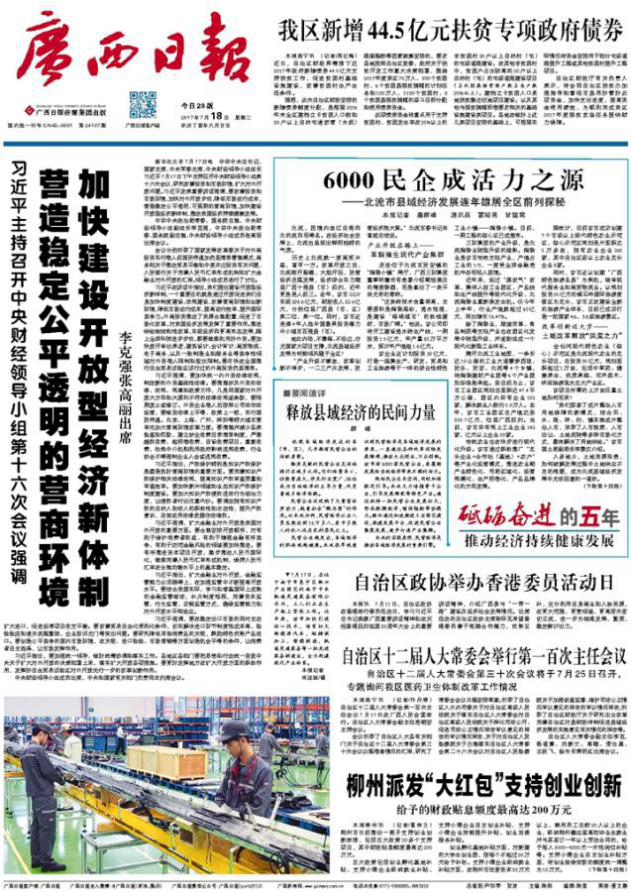 《廣西日報》立足廣西、面向全國,國內(nèi)外公開發(fā)行。目前,星期一至星期五每日出版對開12版,星期六、星期日出版對開8版,彩色印刷,是廣西第一大綜合性日報。新聞信息容量大,??笨鄻?,適應(yīng)多層次讀者需要,集指導(dǎo)性、權(quán)威性、科學性、服務(wù)性、實用性、知識性和趣味性為一體。