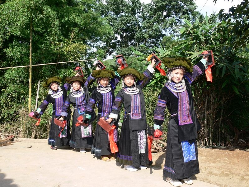 板凳舞,苗語(yǔ)稱:“卡牛檔”。關(guān)于它的起源,在黑苗中一直這樣流傳:相傳在很久以前,寨中的男子都參軍打仗去了,剩下老人、婦女和小孩,由于地處高山,深林密布,經(jīng)常有野獸出沒(méi),婦女們?yōu)榱藟涯?,白天晚上都喜歡聚在一起,用小板凳互相擊打,敲出聲響,驅(qū)趕野獸……漸漸地,就慢慢演變成了在當(dāng)?shù)孛缱鍕D女生小孩辦滿月時(shí),拿小板凳敲擊舞蹈祝福小孩的習(xí)俗。