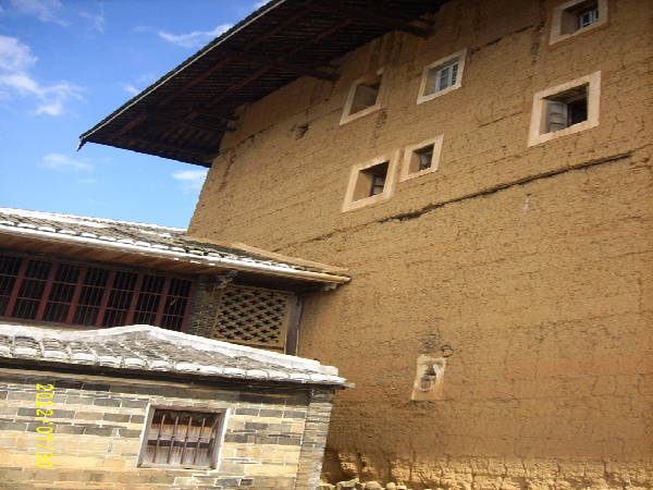 土樓和長城差不多,是用糯米、石灰、蛋清和泥土混合而成的外墻,內(nèi)部是用黃木和杉木,夏可抵暑氣,冬可抵冽風,還可自動調(diào)節(jié)室內(nèi)的溫度。
