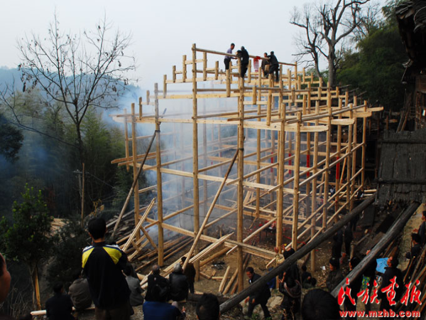 建房是人生中的一件大事,同時也有許多講究和說法。準(zhǔn)備建房材料時首先要選取上乘的中柱。在砍伐中柱時需準(zhǔn)備香燭、紙錢、酒、魚、糯米飯到樹下祭奠,主人先砍幾斧,再由其他親友砍伐。備好的材料經(jīng)曬干、推刨后由木匠發(fā)墨。發(fā)墨時主人在木柱一端執(zhí)線,木匠在柱上拉直用力一彈,墨線筆直均勻,則表示吉利,否則還要重新發(fā)墨。立房是家中的一件大事。一般立房架和上梁同日進(jìn)行,屆時族人都會來幫忙,他們齊心協(xié)力把新房立起來,來參加立房架儀式的親戚朋友都會帶禮品來慶賀。立大門時要殺一只公雞祭祀。待蓋房、裝飾等完成之后再擇吉日喬遷。