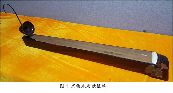 京族獨弦琴的制作工藝傳統(tǒng),其材質(zhì)有竹、木質(zhì)兩種。竹制獨弦琴的琴體通常取大斑竹為原料,制作時選粗細勻稱、質(zhì)地密實的一段竹子,截長為120厘米左右長度,再劈成1/3和2/3兩部分,取2/3部分的竹筒進行打磨、打孔,再安裝竹制搖桿、麻繩或竹篾削制的琴弦,竹質(zhì)獨弦琴即制成;木質(zhì)獨弦琴的琴體多選生長于當?shù)氐耐┠緸樵牧?,取長約100-120厘米的木料,切割成數(shù)塊木板,打磨后將木板拼成長方形木匣為琴身,一端插上一根與琴身呈直角的、用牛角制成的弧形柱子,圓柱上安裝一瓢型(葫蘆形)共鳴器,再將一根金屬絲從瓢中心引向琴的另一端,固定在的弦鈕上,木質(zhì)獨弦琴即制成。