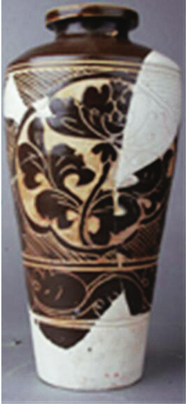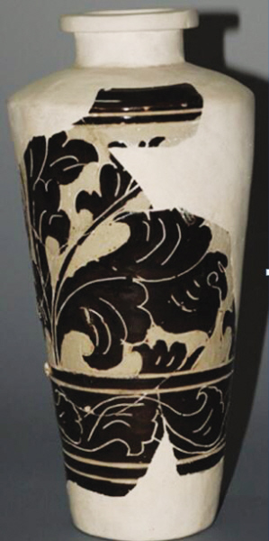 西夏經(jīng)瓶是靈武窯最具特色的西夏器類之一,其器型瘦長,肩部最寬,下腹?jié)u收,平底,假圈足;胎質(zhì)細膩致密,外壁施釉均不到底,內(nèi)壁施滿釉,釉色以褐釉為主,也有黑釉,白釉少見,白釉瓷均施化妝土;紋飾以牡丹花為主,也有菊花,少見海棠花,輔紋以海水波浪紋和斜線紋為主,花紋細膩,構(gòu)圖流暢,疏密得當;整體構(gòu)圖大量使用開光,搭配合理,講究對稱。