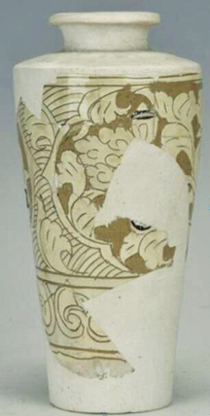 褐釉剔刻花葉紋經(jīng)瓶,高31厘米、口徑8.5厘米、底徑9厘米,二級文物。三組雙弦紋將腹部分為三部分,上部剔刻折枝花葉紋,葉片肥碩,左右舒展。其下刻劃一周卷葉紋,其下光素。內(nèi)外施褐色釉。殘存腹部一半,其余為后修復(fù)。