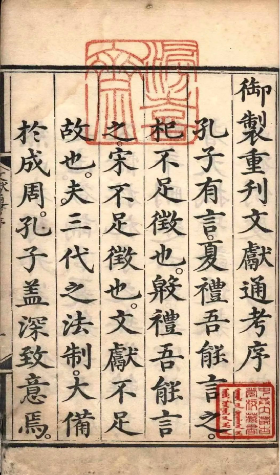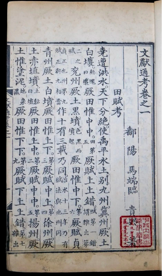 《文獻(xiàn)通考》所述歷代典章制度,上起上古,下至南宋寧宗嘉定末年。該書立目參照《通典》,并有所發(fā)展。全書分為二十四考,每一考前有小序,說明著述的成規(guī),考訂的新意,每考之下又分為若干子目,子目內(nèi)容皆按時間先后排列。撰寫體例是按文、獻(xiàn)、考三個層次排列,凡頂格排行者,即所謂“文”,也就是“敘事”部分。凡低一格排行者,即所謂的“獻(xiàn)”,也就是“論事”部分。凡低兩格排行者,即所謂“考”,也就是作者自己的議論,其內(nèi)容包括指點歷史演變的線索、評判是非、考辨史料和解釋名物等。