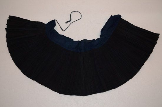 裙子為家織土布,青色細(xì)褶裙。圍腰中部為織,所繡圖案為魚紋、鳳鳥紋和“蝴蝶媽媽”、“人騎馬”等組合而成的幾何紋。