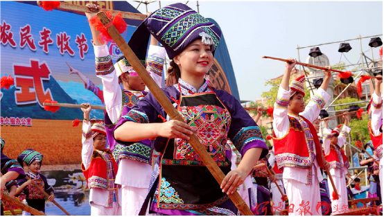 都安瑤族自治縣群眾打起扁擔,歡慶“中國農民豐收節(jié)”。