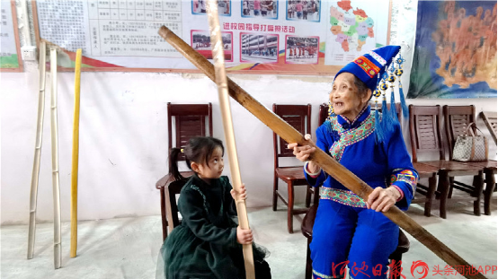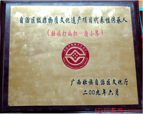 今年已經88歲高齡的“壯族打扁擔”技藝傳承人唐小琴,她從小即耳濡目染,跟村里老人、長者學習打扁擔,后因打扁擔需要指揮,又學習皮鼓打法。1961年4月,唐小琴從學校調入縣文化館任文化藝術輔導員,挖掘整理了《壯族打扁擔》《板凳舞》《斑鳩舞》等一大批傳統(tǒng)舞蹈,并多次在自治區(qū)、河池地區(qū)的比賽、調演上獲獎。1986年退休后,仍然致力于《壯族打扁擔》的傳承工作,2004年,組建都安縣老干康樂藝術團,帶動安陽鎮(zhèn)退休老人學習打扁擔技藝。2009年,她被確認為自治區(qū)非物質文物遺產項目“壯族打扁擔”代表性傳承人。