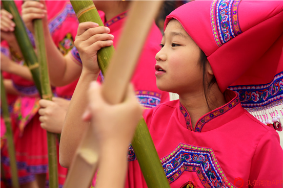 一群少年兒童歡聚在都安縣文體廣場打起扁擔,喜迎三月三。