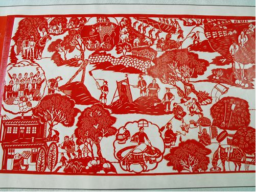 2、達拉特紀事剪紙的歷史價值很高,《農(nóng)民紀事圖》上卷記載了從建國到現(xiàn)在農(nóng)村的發(fā)展變化,在作品中我們看到了很多瀕臨失傳的農(nóng)村生產(chǎn)生活工具和生產(chǎn)方法,也能看到黨和國家在每一年出臺的各項惠農(nóng)利民政策,對于研究歷史具有重大的文獻價值。