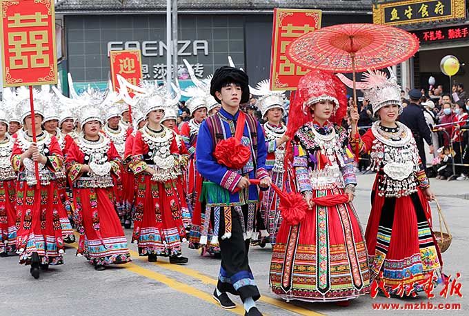 苗族同胞婚俗游行展示。