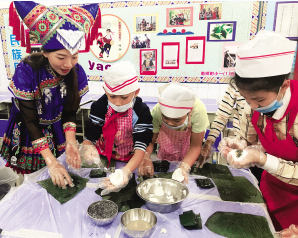 廣西南寧市南師附小把民族團結教育融入日常教學中。圖為老師和同學們一起制作傳統(tǒng)美食。叢蓉攝