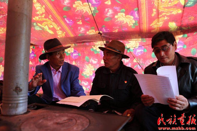 土旦(左)入戶向牧民宣傳草原法律法規(guī)和國家相關草原保護政策(黃若天 攝影)