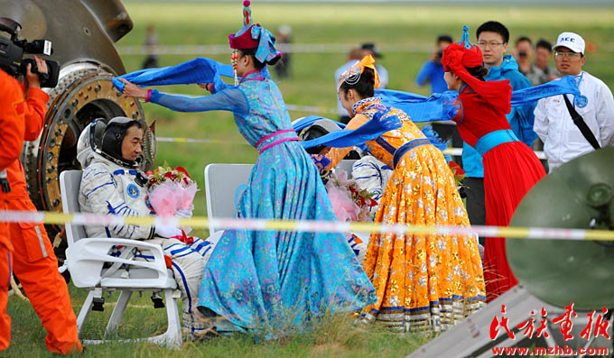 2013年6月26日,神舟十號返回艙平安返回,圓滿完成任務的三位航天員張曉光、聶海勝、王亞平自主出艙后接受蒙古族牧民的祝賀(吳運生 攝影)
