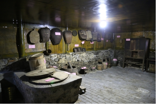 “農(nóng)耕文化陳列館”是由兩棟傳統(tǒng)的木質(zhì)民房改建,從大門進(jìn)來,門的兩邊放置有農(nóng)具,右側(cè)一個是存儲糧食的倉庫,沿著倉庫邊上的石階往上走,從小門進(jìn)去,大大小小的簸箕、飯甑、貓籮、魚籮等農(nóng)具應(yīng)有盡有。