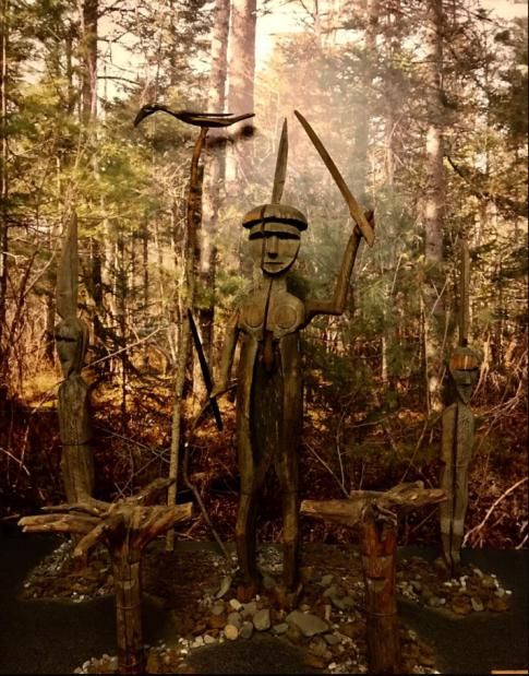 展區(qū)內(nèi)還放置著一組木質(zhì)神偶,這些神偶來自赫哲族部落。佇立在最中間的神偶起著山神的作用,面目清晰與人等高,手中舉著木劍,挖空的腹部能吞掉妖魔鬼怪,一顆碩大的心臟代表強悍的法力,靠墻斜放著一根高高的木桿,頂端棲息著一只鳥(喬卡鳥)。