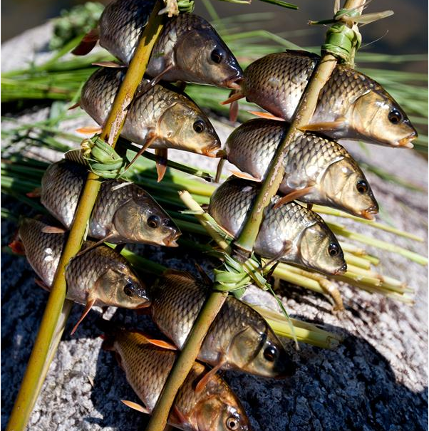 燒魚是廣西融水苗胞的習(xí)俗之一,融水的苗族同胞素有在稻田里養(yǎng)魚的習(xí)慣,每年春插,苗家人向來喜歡在稻田里放養(yǎng)鯉魚。每年的秋收稻黃時節(jié)也是田鯉肥壯之時,這時來自四鄉(xiāng)八寨眾多的各民族兄弟便匯聚起來,點燃一堆堆篝火,燒田鯉吃野餐,盡享豐收喜悅。燒魚從9月稻黃收割開始持續(xù)到12月底才正式結(jié)束,故名“元寶山金秋燒魚季”。燒魚季節(jié),苗寨家家戶戶釀起醇濃的甜酒,蒸著香噴噴的糯米飯,帶上食鹽、辣椒、蒜苗、蔥花、薄荷等佐料上山去剪禾。晌午時候,他們在田頭或田邊的平地?zé)鹨欢讯洋艋?,從田里抓來一籠籠活蹦亂跳的鯉魚,用樹枝或竹片把魚一條條串起,排成一排,然后放在紅彤彤的火炭上翻來覆去地烤,大約半小時左右,魚被烤炙得“呲呲”作響,水分烤干,慢慢地變黃,直至熟透,香飄四溢,遠遠就可聞到香味。