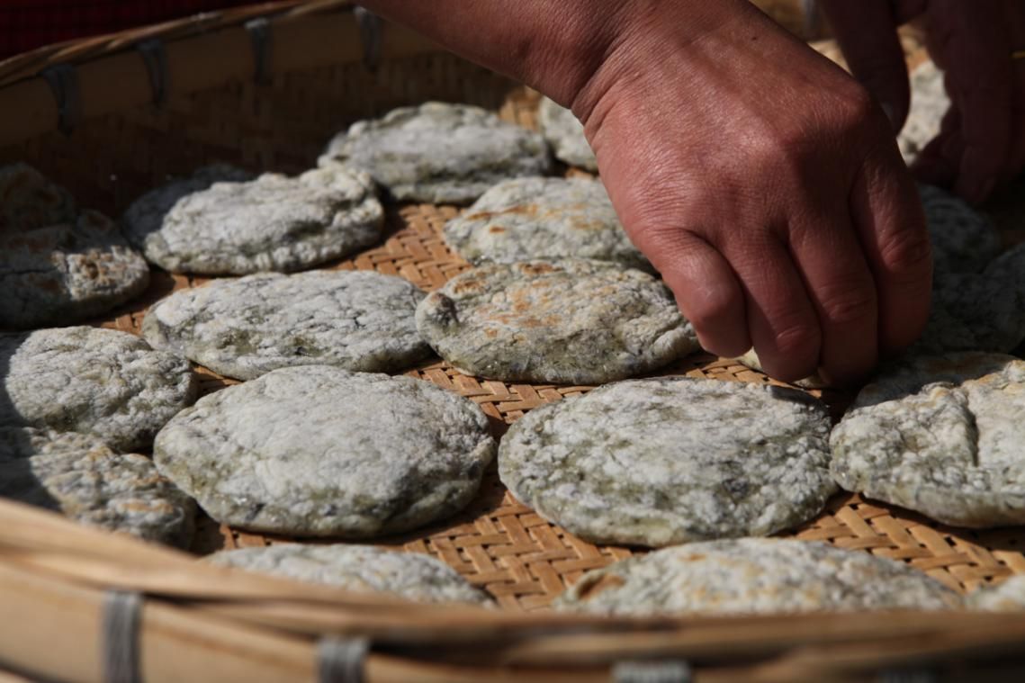 除了少部分近期使用,需要及時(shí)加工,大部分清明菜將進(jìn)入儲(chǔ)存的工序。張國(guó)秀將煮熟的清明菜置于陽(yáng)光下暴曬,水分的減少抑制了酶的活性,完全曬干后能保存半年之久。為了保證一年的供應(yīng),另一部分需要放入冰柜中冷藏。