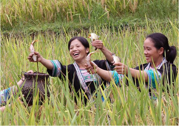 吃的時(shí)候,大家圍攏到火堆,一手拿著糯米飯,一手拿著燒鯉,撕開(kāi)成片,邊蘸鹽水邊吃。男人舉杯對(duì)飲,到處是“呀-嗚-呀-嗚-”的喜慶豐收喊聲和悅耳動(dòng)聽(tīng)的苗歌聲,好一幅農(nóng)家樂(lè)圖畫(huà)。